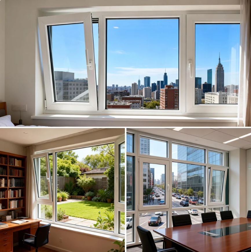 PVC tilt and turn windows offer flexible operation, combining inward tilting for controlled airflow and full opening for maximum ventilation. The multi-point locking system enhances safety, while the PVC frame ensures strong thermal performance and energy savings. Resistant to moisture, corrosion, and UV exposure, these windows require minimal maintenance and retain their appearance over time. They are a practical, stylish solution for modern homes and high-performance buildings.